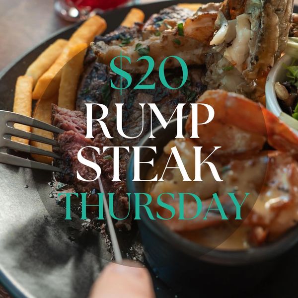 Thursdays are the new favourite. 250g Black Angus Rump Steak. Served with chips, salad and your choice of sauce (mushroom, garlic or pepper) all for $20! Why not treat yourself and make it a surf & turf, for an extra charge.